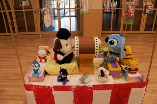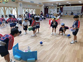 年長組は、ボーリングゲーム、年中組はわたあめ屋さんを出店しました。わたあめ屋さんで販売しているミックスジュースは、年少組の手作り商品です。