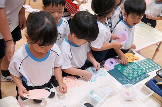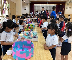 年長組、年中組はお店屋さんのお仕事もあります。「いらっしゃいませー」と大きな声で呼び込みをしたり、お客様に優しく説明したりと