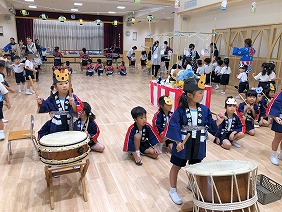 やぐらも手作りしました。年長組の和太鼓に合わせて、みんなで踊ります。小さいお友だちも、お兄さんお姉さんと一緒に踊りながら輪を歩きました。