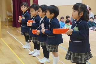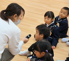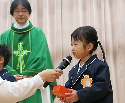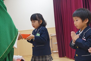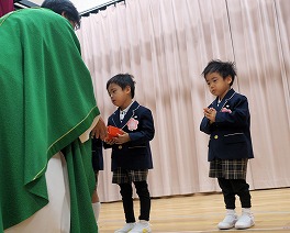 11月生まれのお友だちのお祝いをしました。園長神父様からプレゼントを受取り、祝福をいただきました。