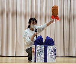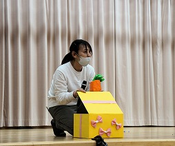 おたのしみタイムは、クイズでした。箱の中身は、動物さんのプレゼントです。何の動物の鳴き声が聞こえるかな?