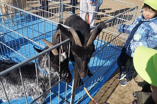 春日マリアこども園に遊びに来てくれたかわいい動物たち。年長児は羊やヤギ、うさぎ等に自宅から持参したエサをあげました。