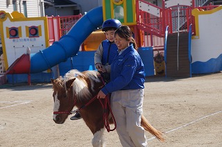 ポニーの乗馬体験も子ども達はとても楽しみしていました。スタッフの方が優しく子ども達にお話をしながらポニーに乗って1周します。