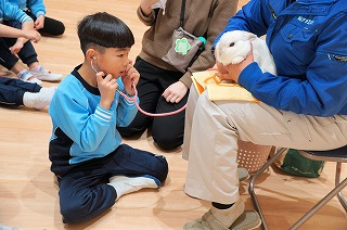 午後からは、ホールで聴診器を使って自分の心音、うさぎの心音を聴きました。うさぎの心音は、早くてびっくりしました。みんな聴診器から聞こえる心音に集中していました。