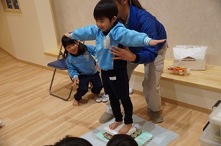 また、生卵の上に乗ったら割れるのか割れないのか!代表のお友達に乗ってもらい、みんなで見守りました。なんと、一つも割れませんでした。
