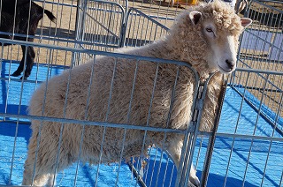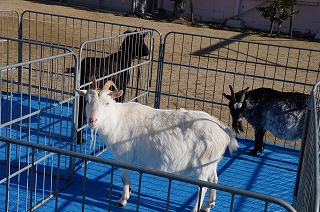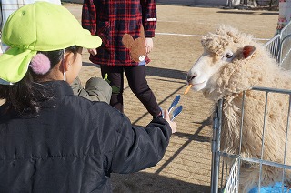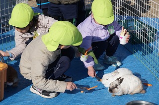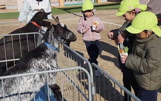 春日マリアこども園に遊びに来てくれたかわいい動物たち。年長児は羊やヤギ、うさぎ等に自宅から持参したエサをあげました。