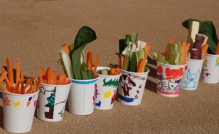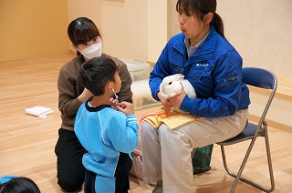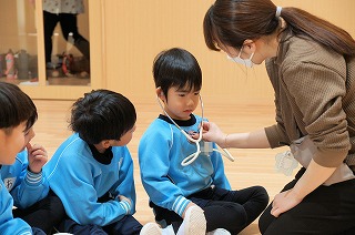 午後からは、ホールで聴診器を使って自分の心音、うさぎの心音を聴きました。うさぎの心音は、早くてびっくりしました。みんな聴診器から聞こえる心音に集中していました。