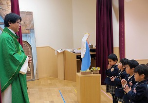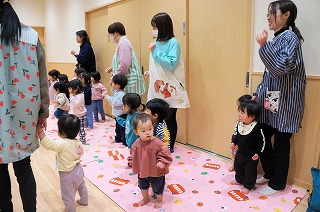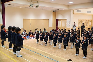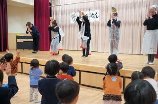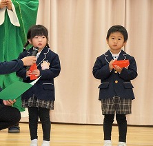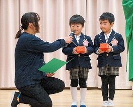 1月生まれのお友達のお祝いをしました。みんなの前でマイクで名前を言うのは緊張しますが、上手に言えました。