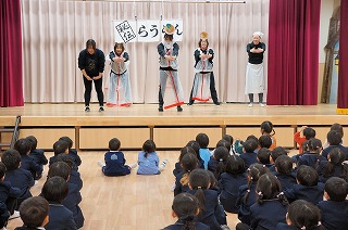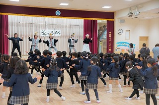 誕生会の後のお楽しみは、【秘伝 らうめん】体操の伝授でした。らうめんの神様に体操を教えてもらい、いざみんなでレッツトライ! 幼児組、乳児組、そして先生達もみんなで伝授してもらった